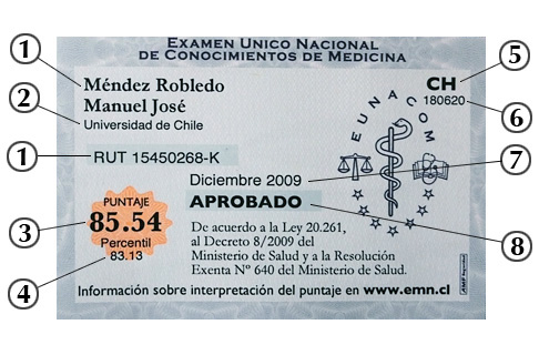 8) Aprobado/Reprobado.- La leyenda APROBADO significa que el puntaje indicado en el certificado es igual o superior al puntaje mínimo definido por el Ministerio de Salud para el año en que se rindió el examen. |