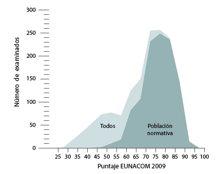 La población normativa del examen, vale decir, el grupo para el que éste está diseñado y cuyos resultados definen el diseño y ajustes del instrumento, está constituída por el grupo de los recién egresados de todas las escuelas de medicina chilenas. A partir de los resultados de este grupo se establecen los percentiles y los parámetros técnicos de las preguntas.